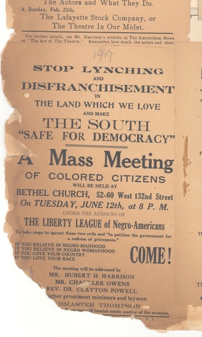 The Liberty League’s Bethel rally was called around the slogans "Stop Lynching and Disfranchisement” and “Make the South 'Safe For Democracy.'” Listed speakers included Harrison, the young activist Chandler Owen, and Dr. Adam Clayton Powell, Sr. (of Abyssinian Baptist Church). Marcus Garvey, a relatively unknown former printer from Jamaica also spoke at the rally in what was his first talk before a major Harlem audience.