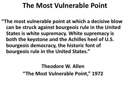 “The most vulnerable point at which a decisive blow can be struck against bourgeois rule in the United States is white supremacy. White supremacy is both the keystone and the Achilles heel of U.S. bourgeois democracy, the historic font of bourgeois rule in the United States.”
